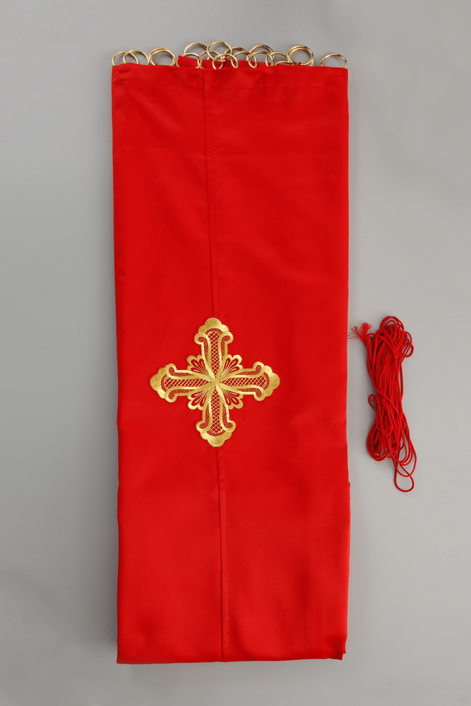 Завеса на Царские врата выполнена из шелка. Декоративный элемент - вышитый крест (автоматическая вышивка). Доступно исполнение во всех богослужебных цветах. Для оформления заказа необходимо указать ширину и высоту завесы.