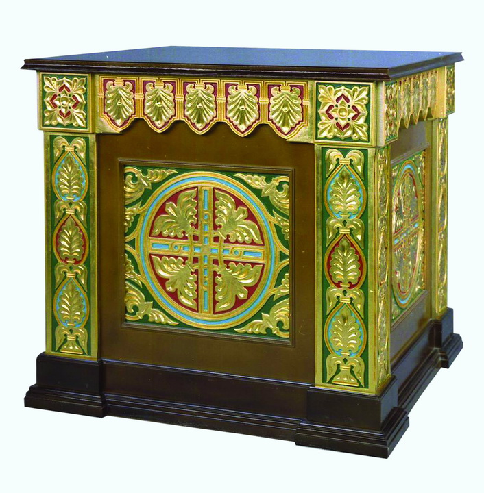 Жертвенник, имеющий форму куба, выполнен из листового шпонированного материала и массива твердых пород дерева. Боковые стороны жертвенника богато декорированы позолоченными узорами и крестами, выполненными методом резьбы по дереву. Размер изделия составляет 1000х1000х1000 мм.