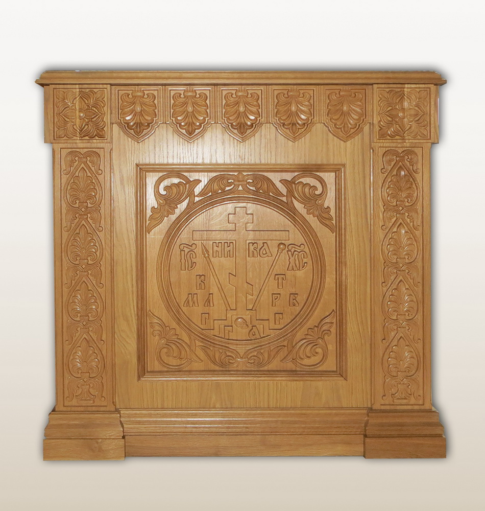 Минималистичный жертвенник приятного светло-орехового цвета выполнен из массива твердых пород древесины и покрыт лаком. На передней части жертвенника изображен восьмиконечный крест – символ победы Христа над смертью и диаволом. Боковые стороны жертвенника богато декорированы растительными узорами, выполненными методом резьбы по дереву. Размер изделия составляет 1000х1000х1000 мм.