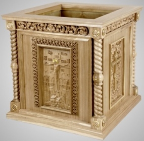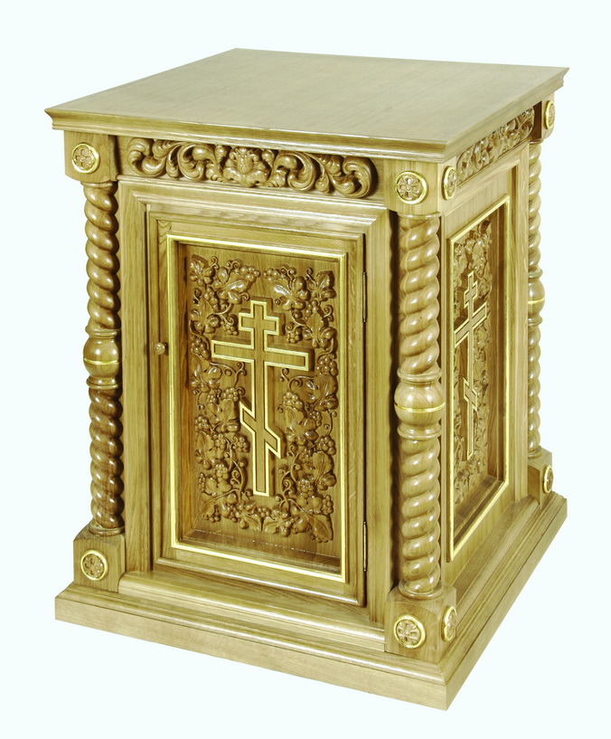 Жертвенник с квадратной столешницей выполнен из листового шпонированного материала и массива твердых пород дерева, а покрыт лаком. Боковые стороны жертвенника богато декорированы узорами, выполненными методом резьбы по дереву. На мягком ореховом фоне ярко выделяются кресты, покрытые сусальным золотом. Внутри жертвенника есть две удобные полки для хранения богослужебных сосудов. Размер изделия составляет 800х800х1000 мм.