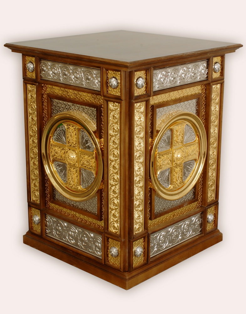 Величественный жертвенник, изготовленный из листового шпонированного материала и массива дерева, станет не только практичной церковной утварью, но и украшением алтаря. Боковые стенки жертвенника покрыты тонкими серебряно-золотыми листами металла с рельефным рисунком, называемыми басмой. На фоне растительных и геометрических узоров ярко выделяются объемные четырехконечные кресты. Размер изделия составляет 800х800х1000 мм.
