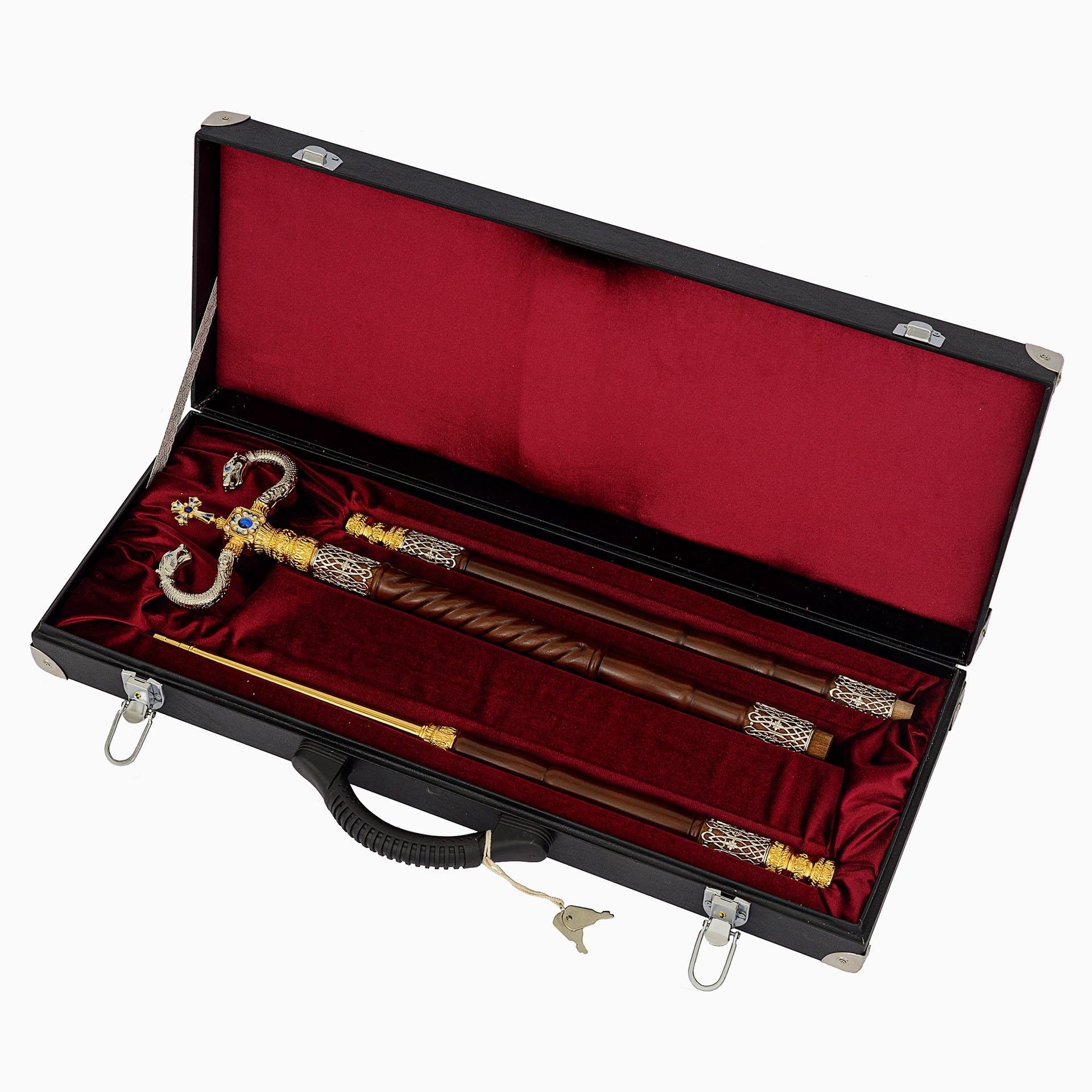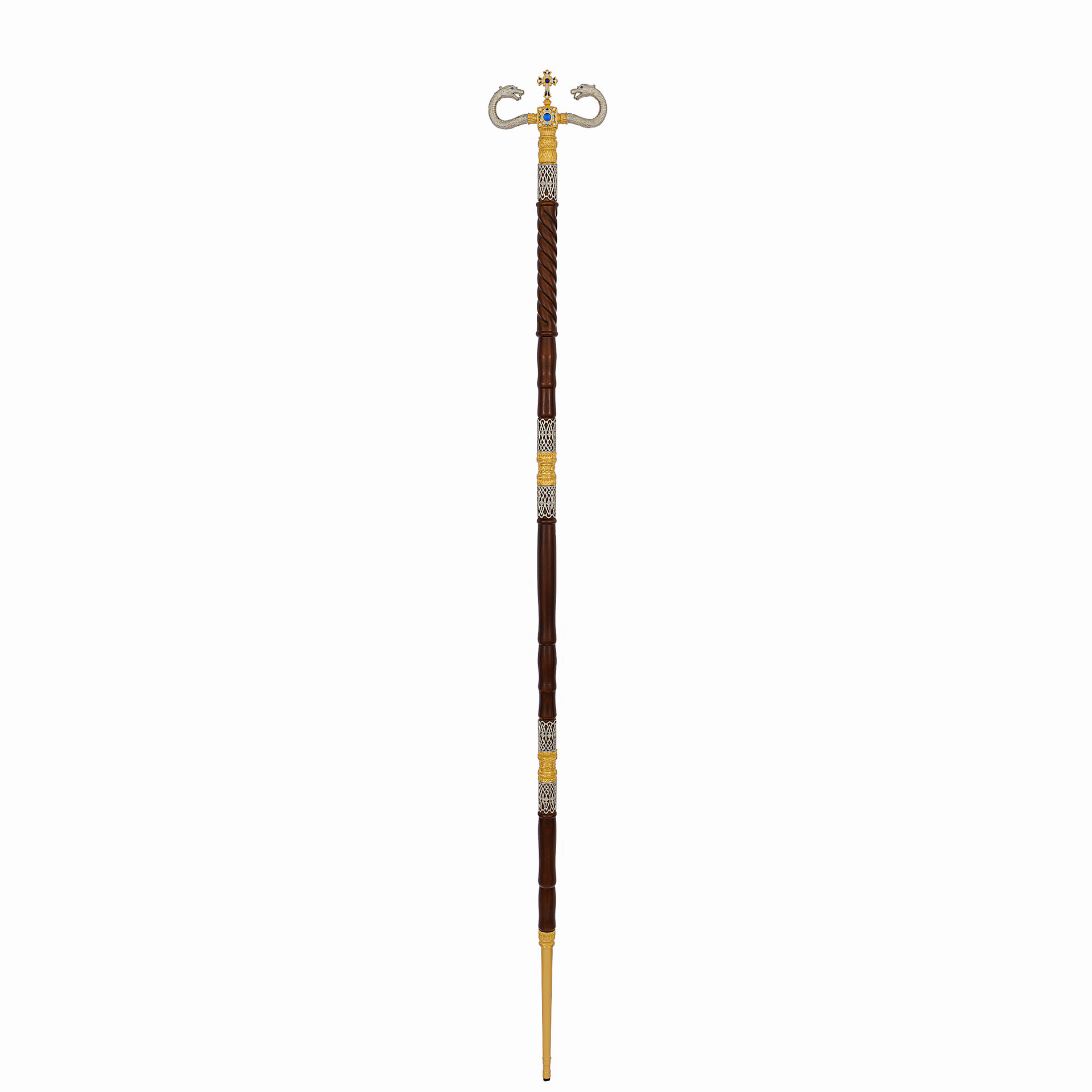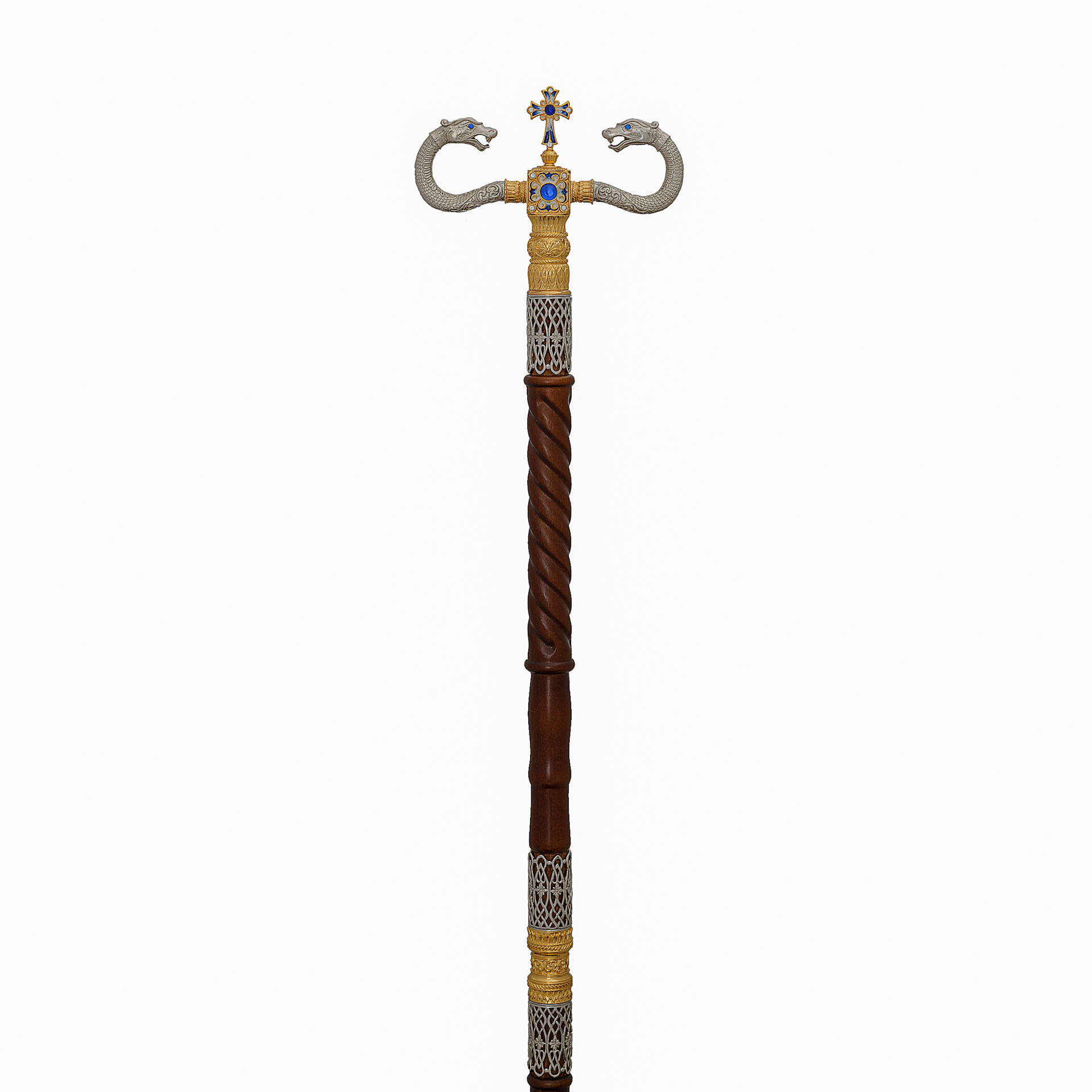 Темно-коричневый липовый посох увенчан изящным набалдашником в форме двух шипящих змей и креста. Сочетание золотого и серебряного оттенков делает посох царственным и торжественным. На металлическом фоне ярко выделяются глаза змей, выполненные из объемных камней, и нежные эмалевые узоры, наполняющие крест. Цвет эмали и камней может быть изменен по желанию заказчика.