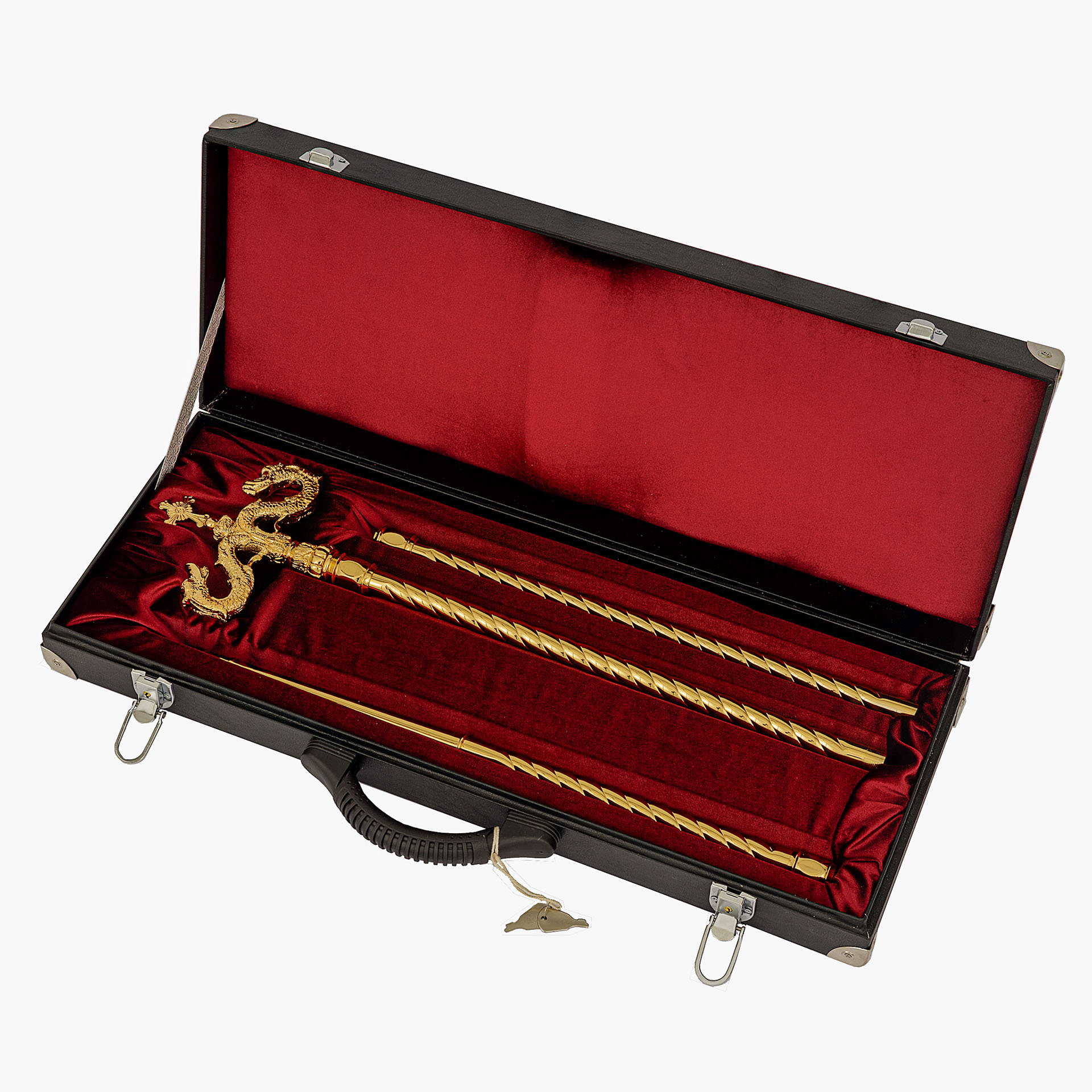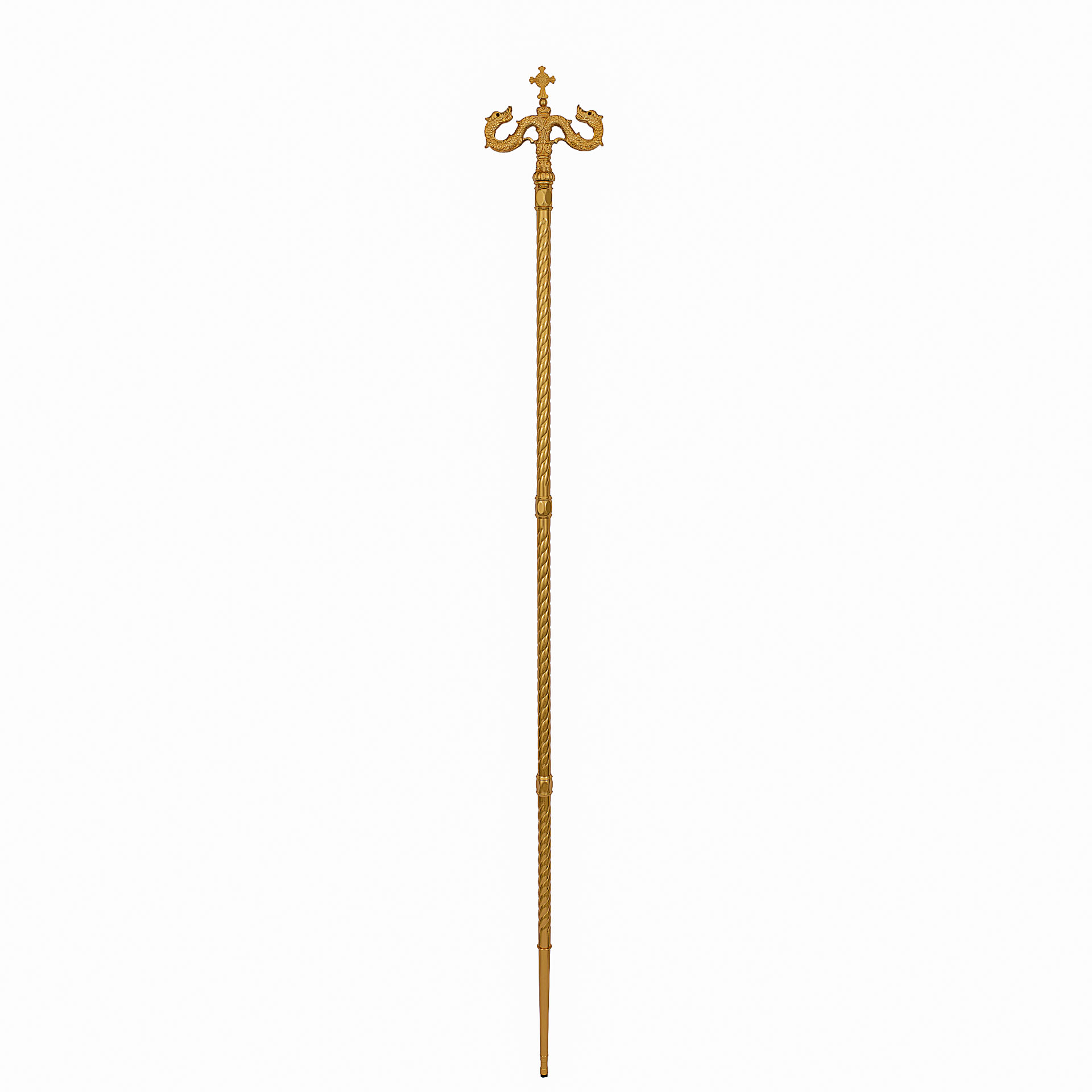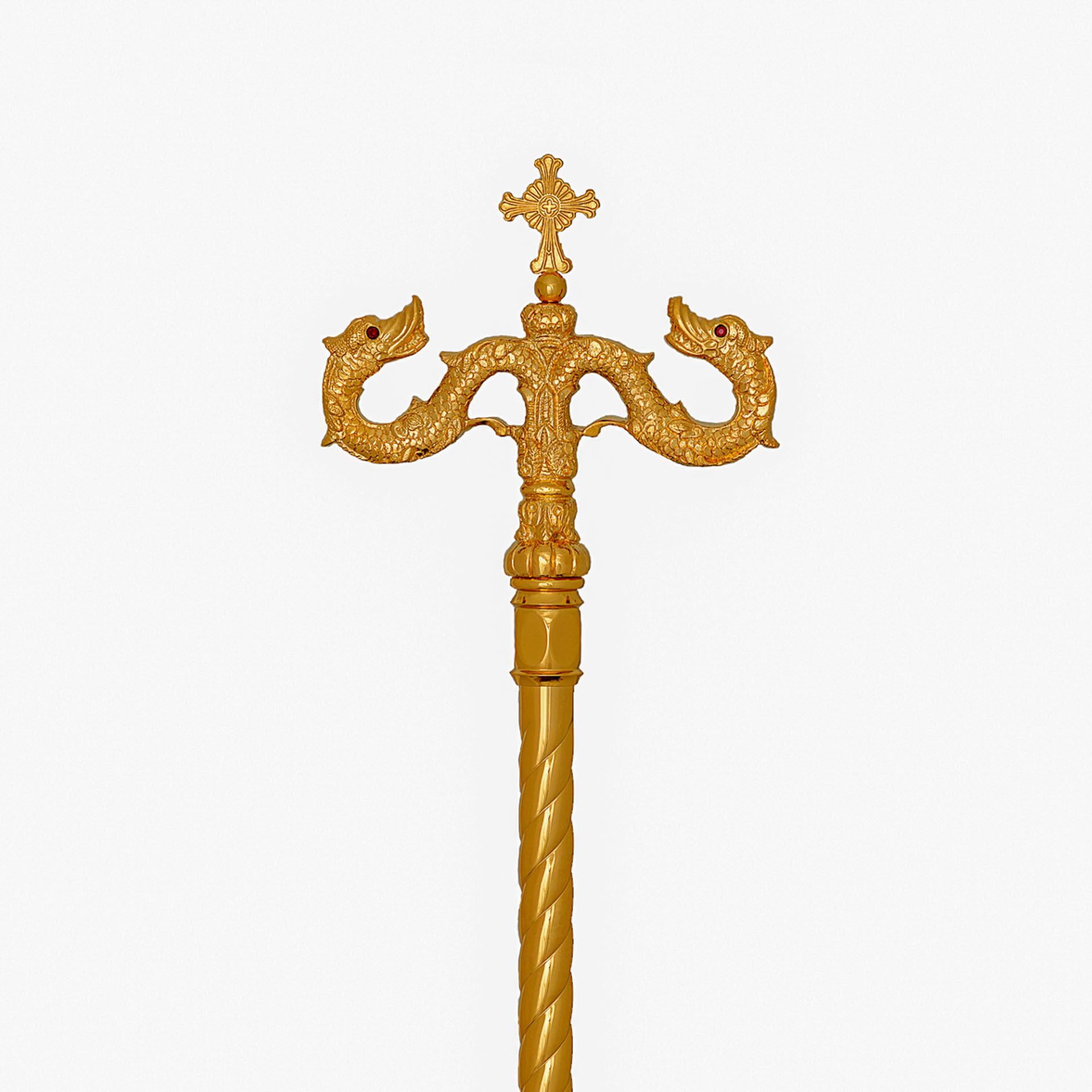Латуневый жезл с литым оглавием в форме двух змей символизирует жезл Моисея, превратившего свой посох в змею для устрашения фараона. В центре набалдашника размещен массивный четырехконечный крест с исходящими лучами. Глаза змей выполненны из камней, цвет которых может быть изменен по желанию заказчика.