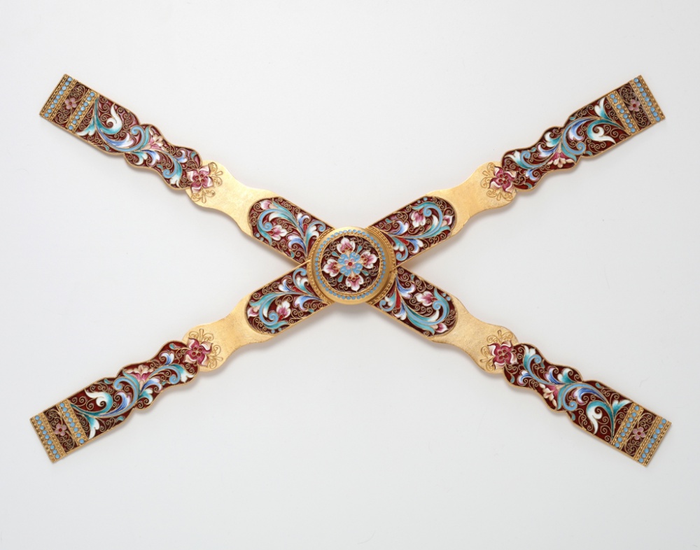 Благородная и изящная, звездица станет украшением праздничных богослужений. Круглый медальон, расположенный на пересечении ножек, украшен четырехконечным крестом, похожим на цветок. На золотом фоне вьется филигранное кружево, раскрашенное контрастной эмалью.